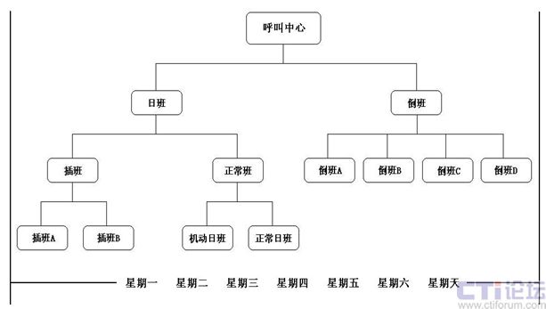 一般正常日班人員應(yīng)是機(jī)動(dòng)日班人員的四倍(規(guī)模較小的呼叫中心,可不用編排機(jī)動(dòng)日班人員),插班的方式可以應(yīng)付呼叫中心高峰呼叫量。這樣的班次編排,即可確保呼叫中心日間的工作覆蓋面,緩解因高峰時(shí)間而有可能對(duì)呼叫中心造成呼叫流失量的情況,亦可應(yīng)付特發(fā)事件。