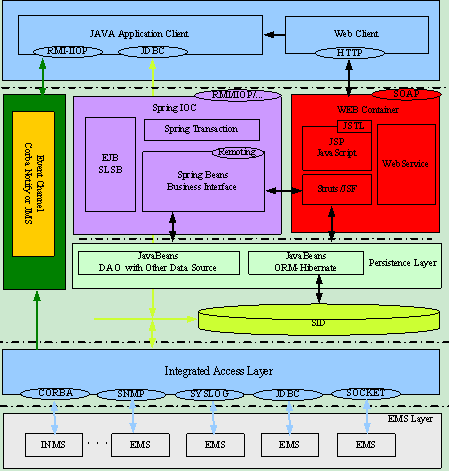 展現(xiàn)層分為兩類(lèi)用戶界面,一種是Java Application類(lèi)胖用戶界面;另外一種是純HTTP Web瘦客戶界面。Java Application頁(yè)面用于實(shí)現(xiàn)拓?fù)涔芾淼痊F(xiàn)階段不易于采用Web技術(shù)實(shí)現(xiàn)的交互頁(yè)面,與其他各層的交互協(xié)議主要采用RMI-IIOP或JDBC。