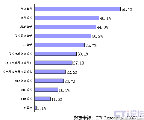 盡管統(tǒng)一通信的概念已經(jīng)被各大廠商廣為宣傳,統(tǒng)一通信的目標(biāo)是實現(xiàn)各種溝通方式的融合,但是從國內(nèi)的企業(yè)來看,他們對統(tǒng)一通信的認識仍然還處于比較模糊的階段,那么從用戶本身來講,他們最需要統(tǒng)一通信能把哪些功能實現(xiàn)相互融合呢?2007年底,國內(nèi)ICT市場研究咨詢機構(gòu)計世資訊(CCW Research)對國內(nèi)的潛在用戶進行了一次大樣本調(diào)研,被調(diào)研的企業(yè)數(shù)量超過800家,企業(yè)領(lǐng)域分布在各行各業(yè),重點以大中型企業(yè)為主,調(diào)研結(jié)果表明,目前國內(nèi)企業(yè)用戶希望能實現(xiàn)互聯(lián)互通功能排在第一位的是辦公套件、占到所有被調(diào)研對象的六成以上,其次是郵件系統(tǒng)和移動電話,占近一半的比例,之后是固話、視頻會議和即時通信,而和用戶業(yè)務(wù)系統(tǒng)的整合,如ERP、CRM則排在最后。