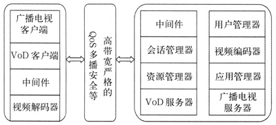 前端播放系統(tǒng)由許多部分組成,包括中間件,MPEG編碼器,VoD服務(wù)器,廣播電視服務(wù)器,用戶管理器,資源管理器,會(huì)話管理器和應(yīng)用管理器。