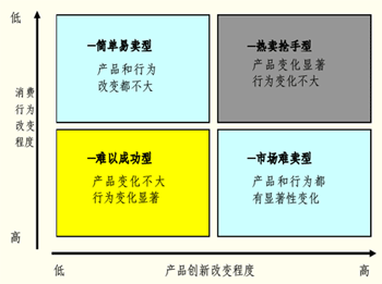 一般來說,產(chǎn)品創(chuàng)新程度越大,取得突破性的成就就越大,但這往往需要消費(fèi)者改變消費(fèi)行為和習(xí)慣。消費(fèi)行為的改變是一個(gè)漸進(jìn)的過程。對于企業(yè)來說,開發(fā)一個(gè)對客戶有價(jià)值的創(chuàng)新產(chǎn)品,要想獲得成功,必須盡量減少消費(fèi)者行為的改變。我們以消費(fèi)行為改變程度和產(chǎn)品創(chuàng)新改變程度兩方面進(jìn)行組合得到一個(gè)矩陣: