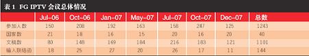 FGIPTV在一年半的時間里共召開了7次會議,收到了1101篇文稿,參加者包括來自40個國家的1243名專家(見表1),其中既包括傳統(tǒng)電信網(wǎng)的專家,也包括來自廣播電視行業(yè)、IT業(yè)的專家,通過這7次會議、提交的文稿以及專家們的貢獻,一方面產(chǎn)生了IPTV的定義,另一方面也形成了21個工作文檔,并根據(jù)這些文檔的內(nèi)容確定了負責(zé)此文檔的相應(yīng)研究組和課題(即Q/SG),詳見表2。