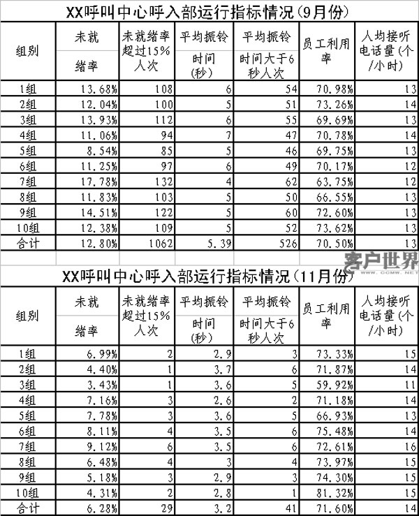 筆者所在呼叫中心從今年10月份開始實(shí)行“四率管理”,以解決現(xiàn)場(chǎng)管理工作的存在的問題,提高現(xiàn)場(chǎng)管理水平,提高服務(wù)效率。從統(tǒng)計(jì)數(shù)據(jù)看(見下表),實(shí)行“四率管理”后,呼叫中心的現(xiàn)場(chǎng)管理水平得到大幅提高,服務(wù)指標(biāo)增長(zhǎng)較快。在員工利用率基本保持不變的情況下,未就緒率、平均振鈴時(shí)間、每小時(shí)接聽電話量等指標(biāo)均得到有效改善。其中,未就緒率從9月份的12.8%降低到6.3%,未就緒率低于15%的員工人次從1062次降低到29次;平均振鈴時(shí)間從5.4秒降低到3.2秒,平均振鈴時(shí)間大于6秒的人次從526人次降低到41人次。每小時(shí)人均接聽電話數(shù)量從13個(gè)提高到14個(gè)。按8小時(shí)工作計(jì)算,每人每天接聽電話數(shù)量增長(zhǎng)10個(gè)左右。具體統(tǒng)計(jì)數(shù)據(jù)見下表。