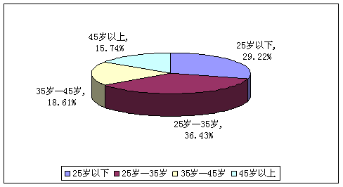 A、25歲以下(29.22%) B、25—35歲(36.43%) C、35歲—45歲(18.61%) D、45歲以上(15.74%)