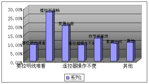 A、要拉明線難看(9.33%) B、播放不流暢(27.63%) C、費(fèi)用太貴(20.18%) D、遙控器操作不便(9.16%)