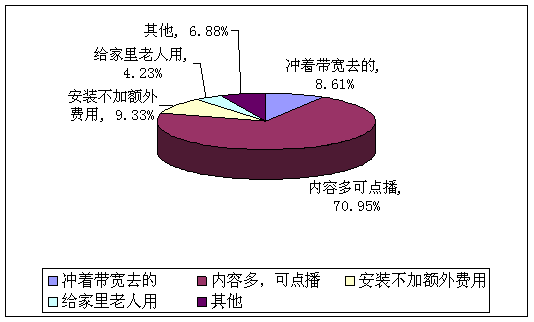 A、沖著帶寬去的(8.61%) B、內(nèi)容多,可點播(70.95%) C、安裝不加額外費(fèi)用(9.33%) D、給家里老人用(4.23%)E、其他(6.88%)