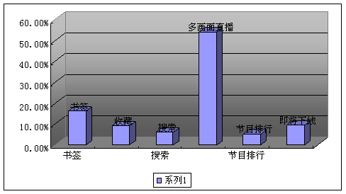 A、書簽(16.10%) B、收藏(9.11%) C、搜索(5.99%) D、多畫面直播(54.05%) E、節(jié)目排行(5.29%)