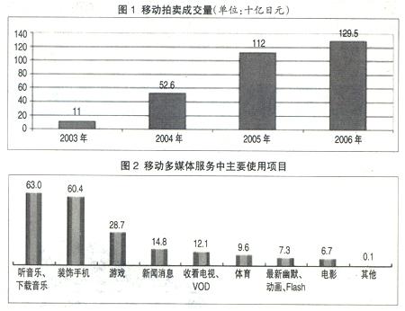 日本的在線購物和拍賣市場起步較晚,但發(fā)展速度較快,用戶的認(rèn)知度也比較高,有41%~48%的移動互聯(lián)網(wǎng)用戶使用過該項業(yè)務(wù)。十幾歲到二十幾歲的女性較傾向于使用該業(yè)務(wù)。2006年移動拍賣的成交量為1295億日元,占到了通過手機在線購買成交量的1/2(見圖1)。
