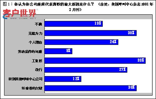 圖1是美國呼叫中心的調(diào)查結(jié)果。從顯示的結(jié)果來看,辭職的最大原因是工資低,其次是升職機(jī)會(huì)少。其中為了從事其他職業(yè)而辭職的占27%,要轉(zhuǎn)到別的客服中心工作的占12%?吹竭@個(gè)結(jié)果之后,發(fā)現(xiàn)即使在美國,客服中心有關(guān)人員也沒有得到相應(yīng)的待遇。