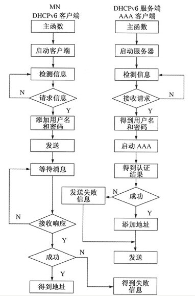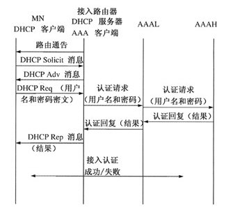 本方案認(rèn)證機(jī)制在比較上述幾種認(rèn)證機(jī)制的優(yōu)缺點(diǎn)的基礎(chǔ)上,根據(jù)層次移動(dòng)IPv6的網(wǎng)絡(luò)特性和運(yùn)行需求,采用IPv6的動(dòng)態(tài)主機(jī)配置協(xié)議(DHCPv6)結(jié)合AAA協(xié)議來(lái)完成AAA認(rèn)證和地址分配過(guò)程。該機(jī)制工作在網(wǎng)絡(luò)層,不依賴鏈路層協(xié)議,有利于移動(dòng)節(jié)點(diǎn)用多種方式接入網(wǎng)絡(luò),具有兼容性好、利于向高層協(xié)議擴(kuò)展、實(shí)現(xiàn)簡(jiǎn)單、容易控制、與移動(dòng)IP結(jié)合性好等優(yōu)點(diǎn)。