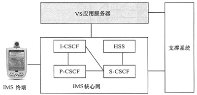 IMS的VS業(yè)務(wù)架構(gòu)如圖2所示,由IMS終端(支持SIP協(xié)議手機(jī))、IMS核心網(wǎng)、VS應(yīng)用服務(wù)器、支撐系統(tǒng)4部分構(gòu)成。IMS移動(dòng)終端提供了用戶使用VS業(yè)務(wù)的操作界面,包括VS業(yè)務(wù)發(fā)起、視頻播放、視頻存儲(chǔ)、VS業(yè)務(wù)應(yīng)答等功能。IMS核心網(wǎng)在支持視頻共享業(yè)務(wù)中,涉及到P-CSCF、S-CSCF、I-CSCF等網(wǎng)元,這些網(wǎng)元的作用是完成SIP移動(dòng)終端之間會(huì)話控制功能,包括會(huì)話的建立、會(huì)話的保存、會(huì)話的釋放等過程。VS應(yīng)用服務(wù)器是VS業(yè)務(wù)系統(tǒng)中最關(guān)鍵的功能實(shí)體,其功能包括對(duì)VS業(yè)務(wù)的請(qǐng)求進(jìn)行信令和媒體流的控制。由于基于IP的H.263協(xié)議能保證在較低的帶寬下傳送較高質(zhì)量的視頻流,因此首選H.263作為VS業(yè)務(wù)的視頻壓縮協(xié)議。此外,為了實(shí)現(xiàn)不同編碼能力的終端能進(jìn)行業(yè)務(wù)互通,VS應(yīng)用服務(wù)器還具備媒體編碼轉(zhuǎn)換的功能。VS應(yīng)用服務(wù)器另一重要的功能就是實(shí)現(xiàn)VS業(yè)務(wù)計(jì)費(fèi),它支持基于業(yè)務(wù)計(jì)費(fèi)、事件計(jì)費(fèi)、時(shí)間計(jì)費(fèi),流量計(jì)費(fèi)等多種靈活的計(jì)費(fèi)方式,并生成計(jì)費(fèi)話單。支撐系統(tǒng)的功能主要是實(shí)現(xiàn)VS業(yè)務(wù)定購、業(yè)務(wù)取消、計(jì)費(fèi)話單的收集匯總等。