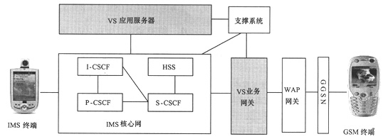 為了實(shí)現(xiàn)IMS用戶與GSM用戶的VS業(yè)務(wù)互通,本文提出了VS業(yè)務(wù)網(wǎng)關(guān)的概念。在VS業(yè)務(wù)架構(gòu)中新增加VS業(yè)務(wù)網(wǎng)關(guān)這一新網(wǎng)元,新的VS業(yè)務(wù)架構(gòu)如圖5所示。
