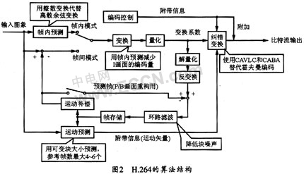 根據(jù)系統(tǒng)要求,本設(shè)計(jì)選擇了ITU的Jm8.5版本baseline profile作為標(biāo)準(zhǔn)算法軟件。ITU的參考軟件JM是基于PC機(jī)設(shè)計(jì)的,故可取得較高的編碼效果。將視頻編解碼軟件移植到DSP時(shí),應(yīng)考慮到DSP系統(tǒng)資源,主要應(yīng)考慮的因素是系統(tǒng)空間(包括程序空間和數(shù)據(jù)空間),所以,需要對(duì)原始的C代碼進(jìn)行評(píng)估,這就需要對(duì)所移植的代碼有所了解。圖2所示是H.264的算法結(jié)構(gòu)。