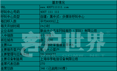 2007年秋天,聯(lián)合大眾汽車網(wǎng)絡(luò)服務(wù)(深圳)有限公司現(xiàn)代化、智能化的大型全國電話呼叫中心落成并投入使用。從投入使用至今,呼叫中心經(jīng)歷了從無到有、不完善到健全的發(fā)展歷程,聯(lián)合大眾24小時全國服務(wù)熱線現(xiàn)已成為客戶價值與公司價值之間傳遞的橋梁。