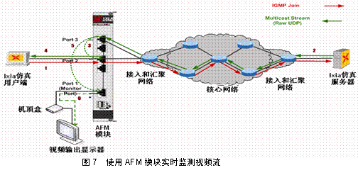 另外一種常見的應(yīng)用場景是對網(wǎng)絡(luò)中存在的IPTV組播流和單播流能夠進(jìn)行被動實(shí)時監(jiān)測并能夠評估相應(yīng)視頻流的視頻質(zhì)量。IXIA獨(dú)特的視頻流提取模塊AFM支持該特性的測試(見圖6)。
