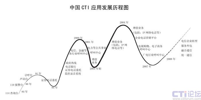 CTI在中國已經(jīng)發(fā)展了二十多年,已經(jīng)從最早的電信行業(yè)CTI應(yīng)用發(fā)展到金融(包括銀行、保險、證劵及基金)、電力、郵政、企業(yè)(包括煙草、汽車、家電、IT、互聯(lián)網(wǎng)、旅游、報業(yè)、航空、物流、醫(yī)療、公共事業(yè)等)、政府、軍隊等各行各業(yè)的應(yīng)用。特別在1995年到2001時期,是CTI應(yīng)用發(fā)展最快,普及面最廣的時期,也是CTI市場進(jìn)入了第二次高潮;從2002開始增值業(yè)務(wù)是整個CTI行業(yè)的突破口,整個行業(yè)以增值業(yè)務(wù)為主,CTI市場進(jìn)入了第三次高潮;從2006年開始,增值業(yè)務(wù)進(jìn)入了衰退期,整個CTI行業(yè)市場出現(xiàn)了嚴(yán)重的危機(jī),加上新的技術(shù)出現(xiàn),技術(shù)的換代,對原來的傳統(tǒng)語音產(chǎn)品和公司是個致命的打擊。