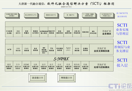 案例:我與大唐中聯(lián)(大唐融合)、和創(chuàng)世紀、華夏成訊等公司的技術開發(fā)人員經過幾年來的摸索與實踐開發(fā),提出軟件化融合通信解決方案(SCTI)。通過計算機的軟件(通信服務系統(tǒng))來實現(xiàn)交換機上的所有通信功能,在互聯(lián)網上實現(xiàn)所有傳統(tǒng)通信網上的所有功能、還實現(xiàn)互聯(lián)網上的新的通信功能,在與傳統(tǒng)通信網上相連,只需增加一塊語音接口卡,就能實現(xiàn)互聯(lián)網與傳統(tǒng)通信的統(tǒng)一。此方案的成本比統(tǒng)一通信、融合通信等解決方案的成本要降幾十倍到上百倍。