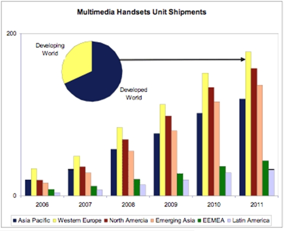 圖2:各地區(qū)的多媒體手機出貨情況(2006-2011)