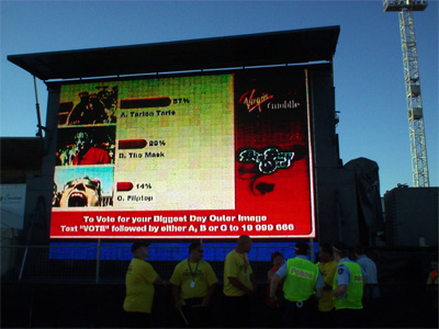 比如,某些公司可能會使用上面所述的調(diào)節(jié)型文本信息收發(fā)方式來顯示滾動的帶狀區(qū)內(nèi)容,但也會在文本顯示的過程中覆蓋某張由手機(jī)用戶拍攝的圖象。這張圖片一般可能是該用戶的貓或狗,然后加上一些有趣的元素。在戶外活動中,我們可以用拍到的圖象來加強(qiáng)文本信息。比如,活動現(xiàn)場可以就屏幕上的一張照片提問“他夠不夠火辣?”。這樣的問答結(jié)果隨后就可以被實時廣播到屏幕上。