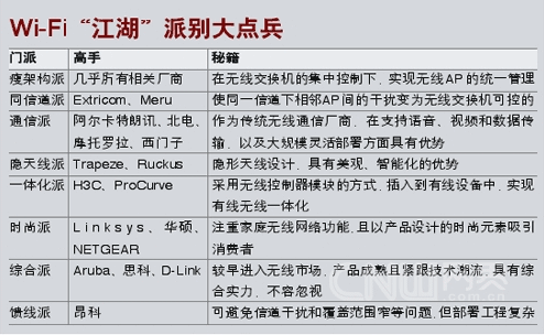 少林、武當(dāng)、華山、峨嵋、丐幫……眾多門(mén)派共同支撐起了武俠小說(shuō)當(dāng)中的“江湖”。而在無(wú)線網(wǎng)絡(luò)的“江湖”上,其實(shí)也存在著很多門(mén)派:比如瘦架構(gòu)派、同信道派、一體化派、通信派、隱天線派、時(shí)尚派等,各家廠商都有自己的看家本事,在極大豐富了無(wú)線產(chǎn)品,更好滿(mǎn)足了用戶(hù)需求的同時(shí),也促進(jìn)了無(wú)線技術(shù)在多個(gè)層面上的深入發(fā)展。