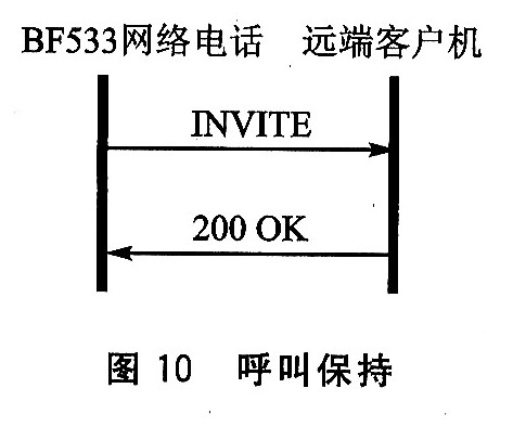 BF533網(wǎng)絡(luò)電話遠(yuǎn)端客戶機遠(yuǎn)端各尸機回復(fù)200 0K接受保持,如圖10所示。同理,呼叫恢復(fù)就是將c參數(shù)恢復(fù)原值,過程與呼叫保持相同。