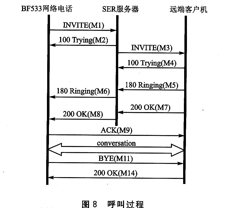 呼叫過程如圖8所示。BF533網(wǎng)絡(luò)電話(BP)先是向SER服務(wù)器發(fā)送了一條INⅥTE消息(M1),要求與遠(yuǎn)端客戶機(RC)進(jìn)行對話。SER馬上回復(fù)一條100