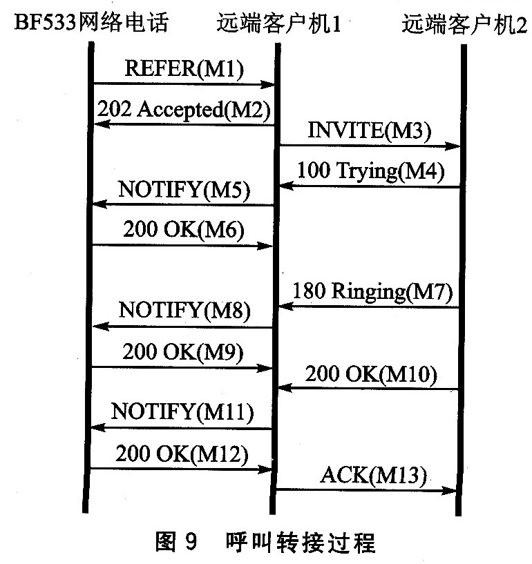 該過程是通過擴(kuò)展的SIP信令REFER來完成的,交互過程如圖9所示。當(dāng)BF533網(wǎng)絡(luò)電話要將它和遠(yuǎn)端客戶機1(RCl)的通話轉(zhuǎn)接到遠(yuǎn)端客戶機2(RC2)時,BF發(fā)送REFER(M1)給RCl,該信息中Refer—To字頭標(biāo)明了RC2的URL,之后RCl回復(fù)202