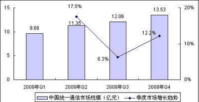 賽迪顧問預(yù)測,2008年全年中國統(tǒng)一通信市場都將保持快速的增長勢頭,雖然第三季度增長趨勢有所放緩,全球金融海嘯的反作用將進(jìn)一步提高企業(yè)對(duì)統(tǒng)一通信產(chǎn)品的認(rèn)知,促進(jìn)中國統(tǒng)一通信市場的發(fā)展,第四季度市場將出現(xiàn)反彈趨勢,增長速度超過12%,市場規(guī)模13.53億元,2008年全年中國統(tǒng)一通信市場規(guī)模將達(dá)到46.6億元,同比增長超過50%。