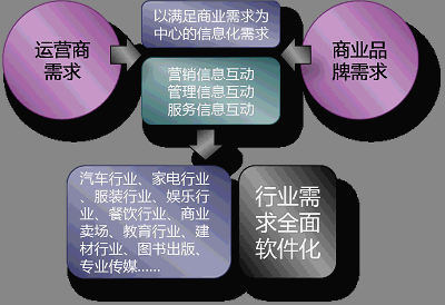 基于這個(gè)需求,那么運(yùn)營(yíng)商更需要的是針對(duì)行業(yè)版的解決方案,有許多的行業(yè)正在期待獲得這樣的商業(yè)信息化平臺(tái),包括:汽車行業(yè)、家電行業(yè)、服裝行業(yè)、娛樂(lè)行業(yè)、餐飲行業(yè)、商業(yè)賣場(chǎng)、教育行業(yè)、建材行業(yè)、圖書出版、專業(yè)傳媒等。