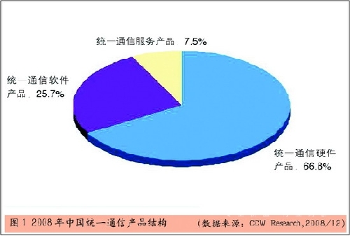 從產(chǎn)品結(jié)構(gòu)角度分析,雖然受硬件設(shè)備價(jià)格因素的影響,統(tǒng)一通信設(shè)備市場仍然是通信市場中最大份額的一部分,市場份額占到66.8%。而且隨著企業(yè)用戶對于統(tǒng)一通信理解能力的加深,統(tǒng)一通信軟件產(chǎn)品與統(tǒng)一通信服務(wù)越來越受到更多企業(yè)的認(rèn)同。與2007年相比,統(tǒng)一通信軟件和服務(wù)產(chǎn)品市場份額有一定比例的增加。2008年,統(tǒng)一通信軟件產(chǎn)品達(dá)到市場份額的25.7%,特別是統(tǒng)一通信服務(wù)產(chǎn)品,增長迅速,市場份額超過7.5%。