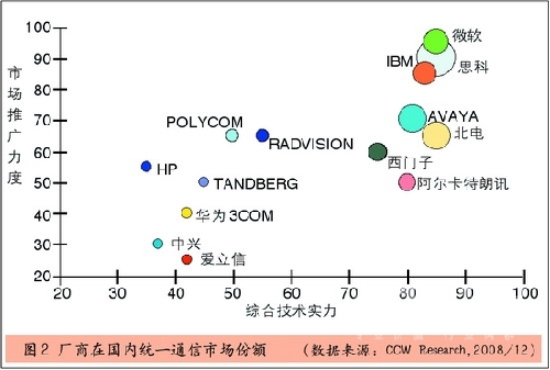 從當(dāng)前國內(nèi)統(tǒng)一通信市場競爭格局來看,在綜合技術(shù)實(shí)力方面,根據(jù)廠商所提供的統(tǒng)一通信解決方案中所能夠提供的各種溝通方式融合的程度以及每個具體功能技術(shù)水平等綜合因素考慮,處于前幾位的分別是思科、微軟、北電、IBM和Avaya,它們的產(chǎn)品線比較長,產(chǎn)品功能也相對比較全面。