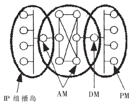混合式組播的核心任務(wù)是為AM完成拓?fù)?包括數(shù)據(jù)拓?fù)浜涂刂仆負(fù)?的構(gòu)建。由于網(wǎng)絡(luò)狀況的動(dòng)態(tài)性,以及客戶端數(shù)量與客戶端加入系統(tǒng)時(shí)間的不確定性,當(dāng)前的應(yīng)用層組播方案一般需要每個(gè)結(jié)點(diǎn)定期與其他全部或一定比例的結(jié)點(diǎn)交換控制信息,以了解其他結(jié)點(diǎn)的狀態(tài),形成控制拓?fù)?保障數(shù)據(jù)拓?fù)涞慕研浴T诮Y(jié)點(diǎn)個(gè)數(shù)逐漸增加時(shí),網(wǎng)絡(luò)上的控制信息數(shù)量會(huì)占用大量的帶寬資源。應(yīng)用層組播的數(shù)據(jù)拓?fù)淇煞譃槎箢?信源樹(shù)和共享樹(shù)。信源樹(shù)必須為每個(gè)組播源保存路由信息,這樣會(huì)占用大量的系統(tǒng)資源。共享樹(shù)傳輸延時(shí)較大。IP視頻會(huì)議系統(tǒng)屬于實(shí)時(shí)交互應(yīng)用,視音頻數(shù)據(jù)占據(jù)很大的帶寬,并且對(duì)端到端傳輸延遲和網(wǎng)絡(luò)抖動(dòng)的要求很高,需要尋找一種既可以減少交換控制信息又可以保證視音頻數(shù)據(jù)實(shí)時(shí)傳輸?shù)耐負(fù)錁?gòu)建方式。為利用排列圖的優(yōu)越特性(如結(jié)點(diǎn)和邊的對(duì)稱性、故障恢復(fù)能力和容錯(cuò)能力、可以嵌入獨(dú)立的組播樹(shù)等),這里采用分層排列圖的結(jié)構(gòu)來(lái)組織混合式組播中的AM。
