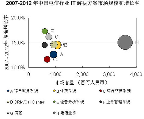 巨大的電信市場蛋糕給產(chǎn)業(yè)鏈的各級(jí)廠商都帶來良好的發(fā)展機(jī)遇,而其運(yùn)營支撐系統(tǒng)市場無疑將是增長最快的一部分。據(jù)市場調(diào)查機(jī)構(gòu)IDC預(yù)計(jì),2007年-2012年電信行業(yè)將注重運(yùn)營支撐系統(tǒng)的全業(yè)務(wù)運(yùn)營整合和支持前端業(yè)務(wù),因此3G增值業(yè)務(wù)、經(jīng)營分析系統(tǒng)、客戶關(guān)系管理系統(tǒng)、IT服務(wù)管理系統(tǒng)等建設(shè)將實(shí)現(xiàn)快速增長。運(yùn)營商的已有項(xiàng)目仍然會(huì)持續(xù)升級(jí)維護(hù),以及配合全業(yè)務(wù)運(yùn)營作出功能上的提升。IDC預(yù)計(jì),2012年電信行業(yè)IT解決方案整體市場規(guī)模將達(dá)到193.5億元人民幣。