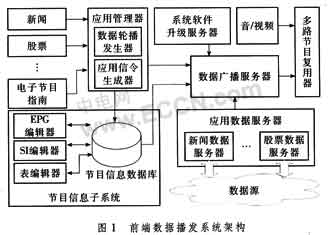 如圖1所示,前端數(shù)據(jù)播發(fā)系統(tǒng)主要包括應(yīng)用管理器,節(jié)目信息子系統(tǒng),數(shù)據(jù)廣播服務(wù)器,系統(tǒng)軟件升級服務(wù)器和應(yīng)用數(shù)據(jù)服務(wù)器等5個部分。