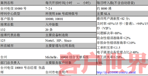中國電信臺(tái)州市的10000客服中心,擁有100多名員工,承擔(dān)該市電信公司對(duì)外的所有客戶服務(wù)工作。中心先后被浙江省電信工會(huì)授予“先進(jìn)女職工集體”,浙江省電信分公司授予“學(xué)習(xí)型示范班組”、“創(chuàng)建學(xué)習(xí)型組織先進(jìn)班組(團(tuán)隊(duì))”,并獲得了“集團(tuán)公司優(yōu)秀10000號(hào)服務(wù)團(tuán)隊(duì)”,同時(shí)被中華全國總工會(huì)、信息產(chǎn)業(yè)部、共青團(tuán)中央授予“全國先進(jìn)女職工集體”以及“全國青年文明號(hào)”的稱號(hào),連續(xù)兩年被信息產(chǎn)業(yè)部評(píng)定為“全國用戶滿意電信服務(wù)明星班組”。