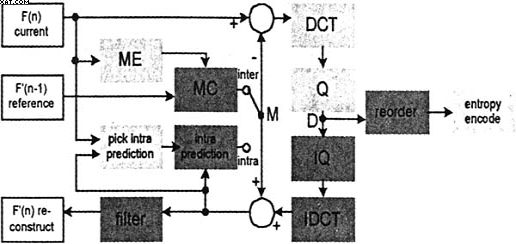 在前向通路(DCT到Q)中,每個MB可以以內模式或交互模式編碼。在內模式中,靠ME模塊在先編碼中求得參考MB。在交互模式中,從現在幀采樣中形成M。