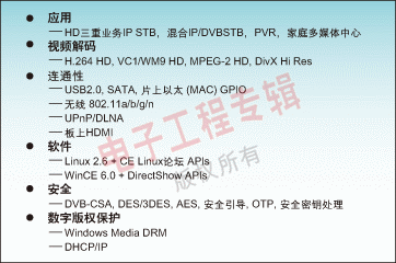 H.264、WM9、AVS的STB810平臺和用于HD H.264 a和VC1的STB225平臺。IP-STB平臺應該提供一個驗證核技術(shù),例如NXP公司基于Nexperia技術(shù)的平臺,并且每一個研發(fā)工具都向后兼容。