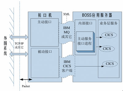 由圖1可知,從調(diào)用方向的角度看,接口可分為主動接口和被動接口,分別表示BOSS調(diào)用外圍系統(tǒng)服務(wù),以及外圍系統(tǒng)調(diào)用BOSS服務(wù)。主動接口由BOSS應(yīng)用服務(wù)器驅(qū)動,即BOSS應(yīng)用服務(wù)器上的主動服務(wù)接口進程,是調(diào)用CICS對相關(guān)待處理表進行輪詢,并將每一條記錄封裝為一條消息放入MQ隊列(該隊列均由消息組成),接口機上的主動接口再從隊列中取出消息進行解析,進而根據(jù)控制信息發(fā)送到指定系統(tǒng)執(zhí)行。被動接口則是由外圍系統(tǒng)驅(qū)動,通過接口機上的CICS客戶端調(diào)用BOSS應(yīng)用服務(wù)器上的業(yè)務(wù)層服務(wù)操作數(shù)據(jù)庫。