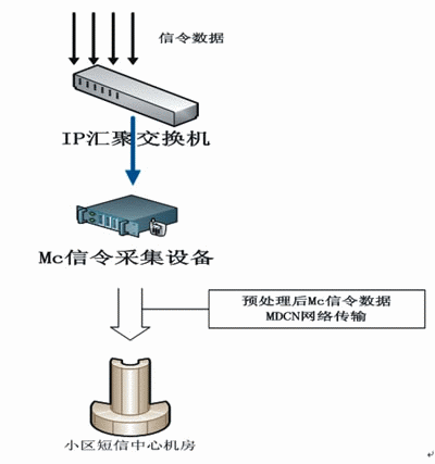 在軟交換模式下,在不影響信令傳輸?shù)那疤嵯拢^(qū)短信系統(tǒng)通過(guò)對(duì)Mc接口(MGW與MSCServer之間)進(jìn)行IP數(shù)據(jù)采集,替代采集A接口七號(hào)信令數(shù)據(jù),對(duì)采集到的Mc接口數(shù)據(jù)進(jìn)行分析、合成,獲取到小區(qū)短信平臺(tái)所需的重要、關(guān)鍵數(shù)據(jù)。