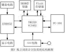 此語音識(shí)別系統(tǒng)的目的讓機(jī)器人能聽懂我們所發(fā)出的簡單的命令,首先由TLC320AD50C采集計(jì)算機(jī)聲卡的語音,經(jīng)過轉(zhuǎn)換后送給TMS320VC5402, TMS320VC5402完成語音信號(hào)處理,即識(shí)別出所發(fā)出的語音,然后把結(jié)果送給AT89S52顯示,同時(shí)通過串行通訊送給機(jī)器人(PC-104),以使機(jī)器人能夠控制自己的行動(dòng)。其結(jié)構(gòu)框圖如圖2所示。