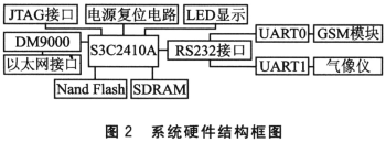 監(jiān)控系統(tǒng)控制器的核心CPU選用基于A(yíng)RM920T內(nèi)核的16/32位RISC處理器 S3C2410A。該處理器功能強(qiáng)、性?xún)r(jià)比高、功耗低,提供了一套較完整的通用外圍設(shè)備接口,帶MMU(內(nèi)存管理單元),可支持Linux、μC/OS- II、WindowsCE等多種操作系統(tǒng)的移植。系統(tǒng)硬件結(jié)構(gòu)框圖如圖2所示。