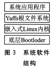 整個(gè)系統(tǒng)軟件結(jié)構(gòu)從下到上大體可分為3個(gè)層次,如圖3所示:底層的Bootloder、嵌入式Linux內(nèi)核以及系統(tǒng)應(yīng)用程序。