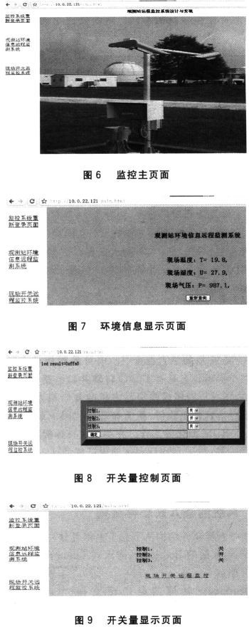 該監(jiān)控主頁(yè)面左側(cè)顯示有3個(gè)模塊:重新登陸頁(yè)面;觀(guān)測(cè)站遠(yuǎn)程環(huán)境信息檢測(cè)系統(tǒng),能方便實(shí)時(shí)地查詢(xún)現(xiàn)場(chǎng)的環(huán)境狀態(tài),如圖7所示;現(xiàn)場(chǎng)開(kāi)關(guān)的遠(yuǎn)程監(jiān)控系統(tǒng),可以控制3個(gè)開(kāi)關(guān)量的開(kāi)關(guān),如圖8所示,并能查詢(xún)它們當(dāng)前狀態(tài),設(shè)置監(jiān)控頁(yè)面每隔15