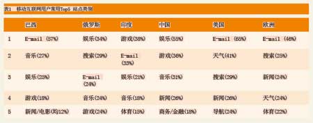 根據(jù)尼爾森2008年一季度的研究結(jié)果,移動(dòng)互聯(lián)網(wǎng)用戶(hù)使用的業(yè)務(wù)集中于五大類(lèi),歐美地區(qū)用戶(hù)使用習(xí)慣比較接近,而中國(guó)用戶(hù)與歐美用戶(hù)存在較大差異。具體見(jiàn)表1。