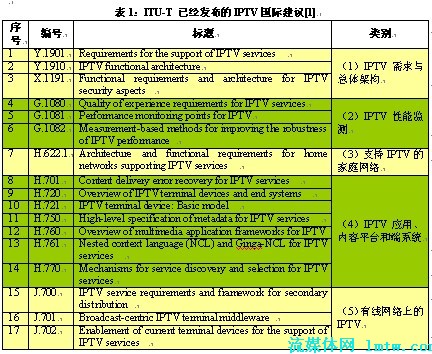 IPTV Forum)、日本IPTV論壇(IPTV FORUM JAPAN)等。ITU-T作為信息通信行業(yè)標(biāo)準(zhǔn)化的官方組織,自2006年就啟動(dòng)了相關(guān)工作,除了自身完成了多項(xiàng)核心國際標(biāo)準(zhǔn)(國際建議)外,還在協(xié)調(diào)全球標(biāo)準(zhǔn)化活動(dòng)方面發(fā)揮了重要作用。