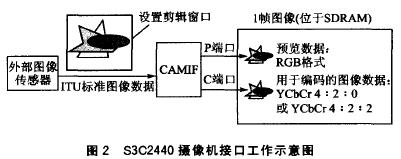 YCbCr8比特標(biāo)準(zhǔn)的圖像數(shù)據(jù)輸入,最大可采樣4096×4096像素的圖像。攝像頭接口可以有兩種模式與DMA控制器進(jìn)行數(shù)據(jù)傳輸:一種是P端口模式,把從攝像頭接口采樣到的圖像數(shù)據(jù)轉(zhuǎn)為RGB數(shù)據(jù),并在DMA控制下傳輸?shù)絊DRAM(一般這種模式用來提供圖像預(yù)覽功能);另一種是C端口模式,把圖像數(shù)據(jù)按照YCbCr4:2:0或4:2:2的格式傳輸?shù)絊DRAM(這種模式主要為MPEG-4、H.263等編碼器提供圖像數(shù)據(jù)的輸入)。上述兩種工作模式都允許設(shè)置一個(gè)剪輯窗口,只有進(jìn)入這個(gè)窗口的圖像數(shù)據(jù)才能夠傳輸?shù)絊DRAM。上述過程可用圖2說明。