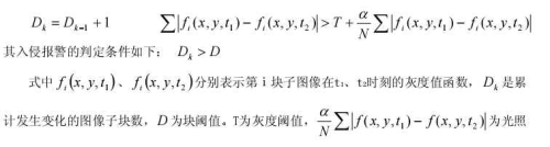 敏感項(xiàng),α為抑制系數(shù),N為檢測區(qū)域內(nèi)的像素?cái)?shù)目。采用這種塊比較法,閾值取值范圍大大減小,易于確定,而且對運(yùn)動目標(biāo)的大小也有一定的選擇性。在檢測每一子塊圖像是否發(fā)生變化時,引入光照敏感項(xiàng),避免了因光照變化引起的虛警。這種方法對光線變化有一定的自適應(yīng)性,擴(kuò)展了系統(tǒng)的動態(tài)適用范圍。