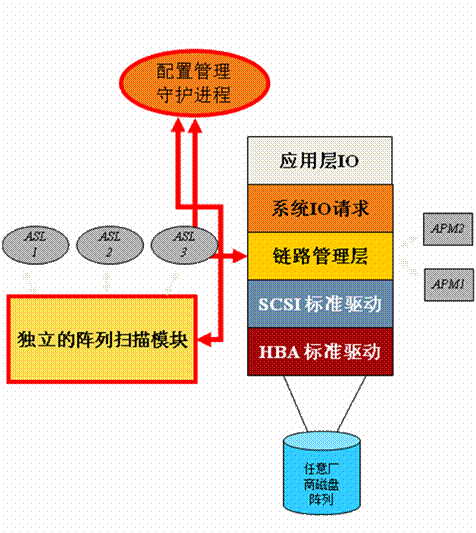 該技術(shù)的特點是通過主機層軟件方式建立存儲管理虛擬層,利用專業(yè)的第三方鏈路管理軟件解決磁盤陣列和主機的連通兼容性。其運行依靠工作在存儲網(wǎng)絡(luò)鏈路管理層的軟件程序來完成,其體系架構(gòu)圖如下: