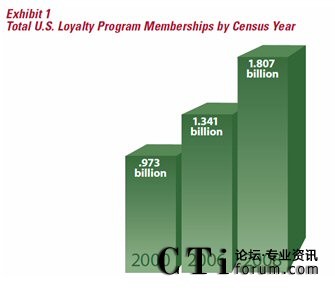 據(jù)權(quán)威的客戶忠誠度研究機構(gòu)COLLOQUY在2009出版的一份報告,2008年底,全美客戶忠誠度計劃的參與人次達到18.07億,平均每個美國家庭參與了14.1個忠誠度計劃,相較2006年底的13.41億參與人次,共增了了24.73%(連續(xù)兩年環(huán)比增長12%/年),而同期美國的GDP增長僅為2.2%。從這一點上看,美國企業(yè)對忠誠度營銷的熱情不減,盡管忠誠度營銷在美國已相當(dāng)成熟,但美國企業(yè)仍然把它當(dāng)作是營銷的重要工具。