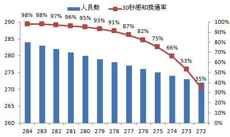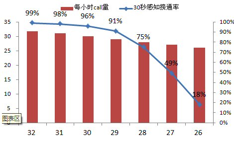 呼叫中心指標體系中最為基礎(chǔ)最為關(guān)鍵的就是接通率指標了,下面,本文重點將呼叫中心部分與接通率相關(guān)的運營數(shù)據(jù)轉(zhuǎn)化成圖表,用erlang-C(國際標準的呼叫中心管理軟件)的計算數(shù)據(jù)表示管理和資源投入對于呼叫中心生產(chǎn)的巨大影響。